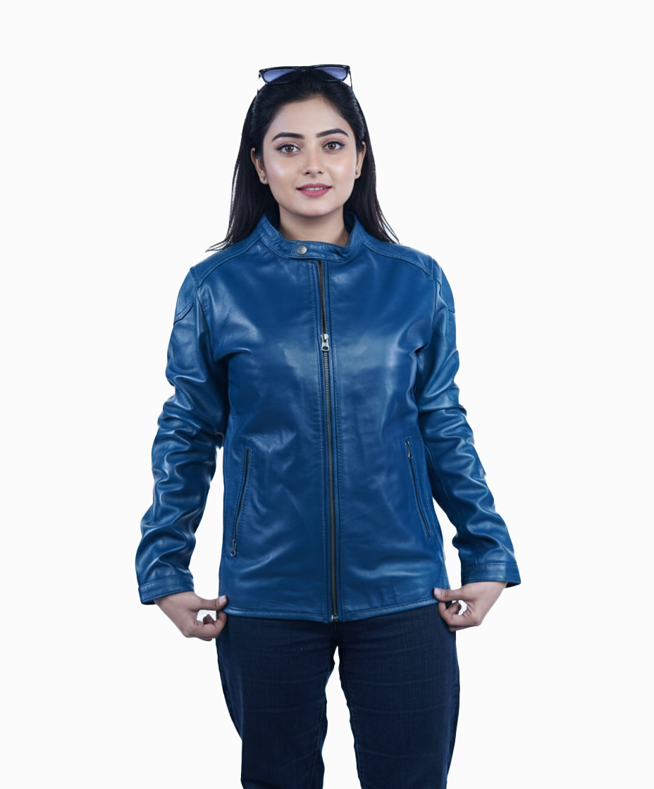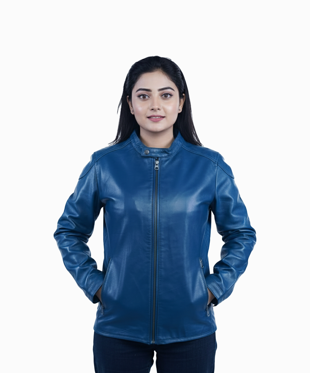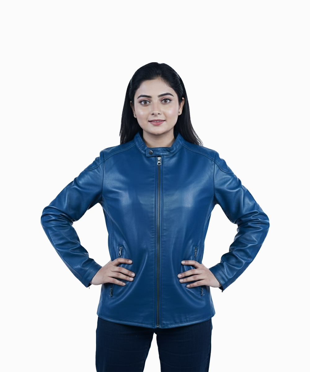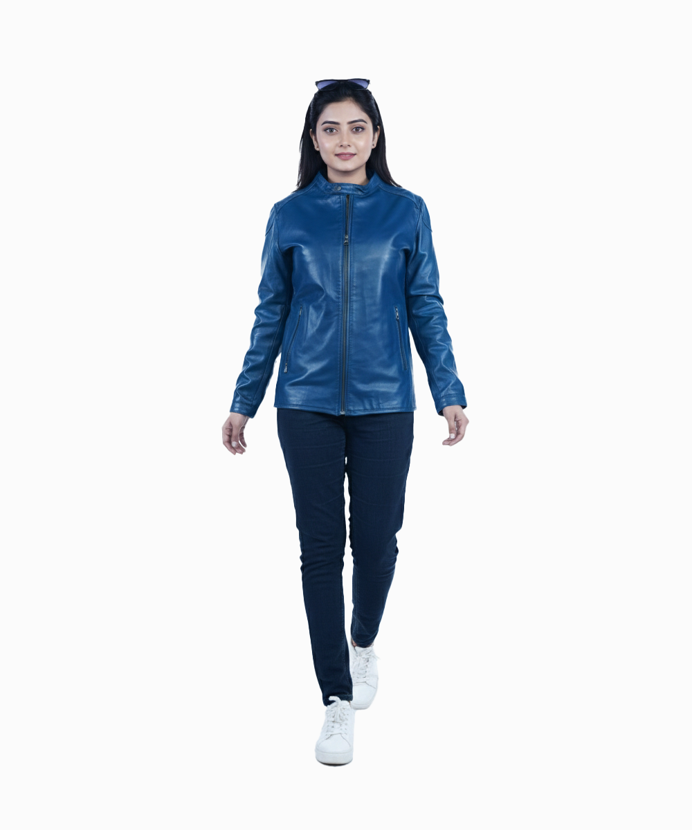 The rich blue color adds a fresh and contemporary touch, while the minimal detailing keeps the look refined and timeless. Featuring a straight front zipper and a neat collar design, this jacket is perfect for women who prefer understated style with premium quality.