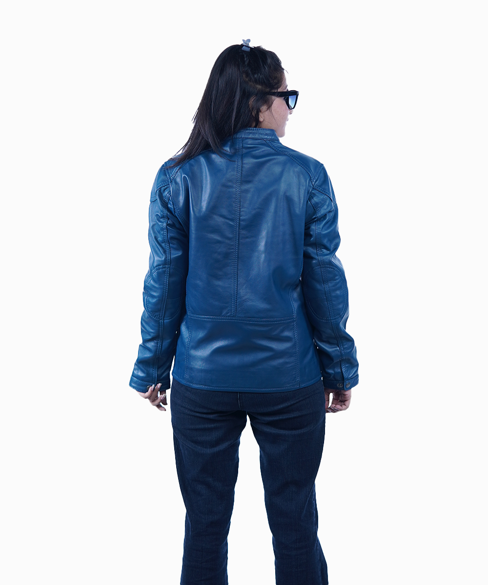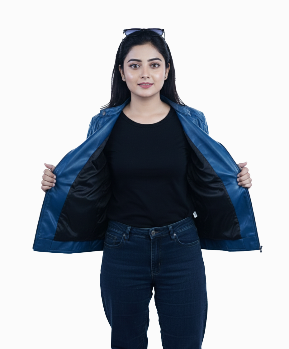 Refresh your wardrobe with this stylish women’s blue leather jacket, designed with a clean, modern silhouette for everyday elegance. Made from 100% genuine sheep leather, this jacket offers a smooth, soft texture with lightweight comfort and excellent durability. Its classic zip-up design makes it a versatile piece that blends effortlessly with casual and smart-casual outfits.