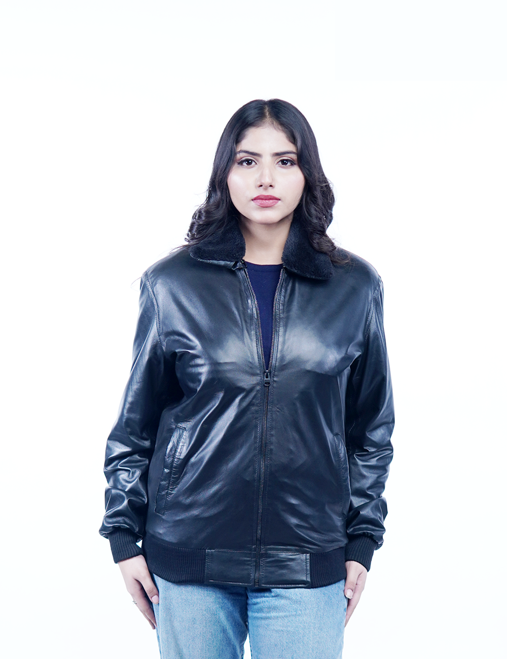 Stay effortlessly stylish with the Umhashco Women’s Black Leather Bomber Jacket, crafted from 100% genuine sheep leather for a soft, premium finish. Designed for both comfort and durability, this jacket features a removable faux fur collar, giving you two looks in one – classic bomber or chic winter coat. With a front YKK zipper closure, rib-knit cuffs and hem, two side pockets, and an inside leather-trimmed pocket, this ladies’ bomber jacket combines functionality with modern fashion. The 100% polyester quilted lining keeps you warm and cozy, making it the perfect choice for winter outings, casual styling, or travel wear.