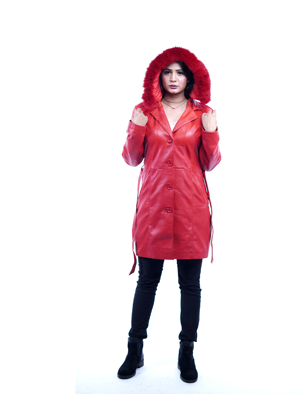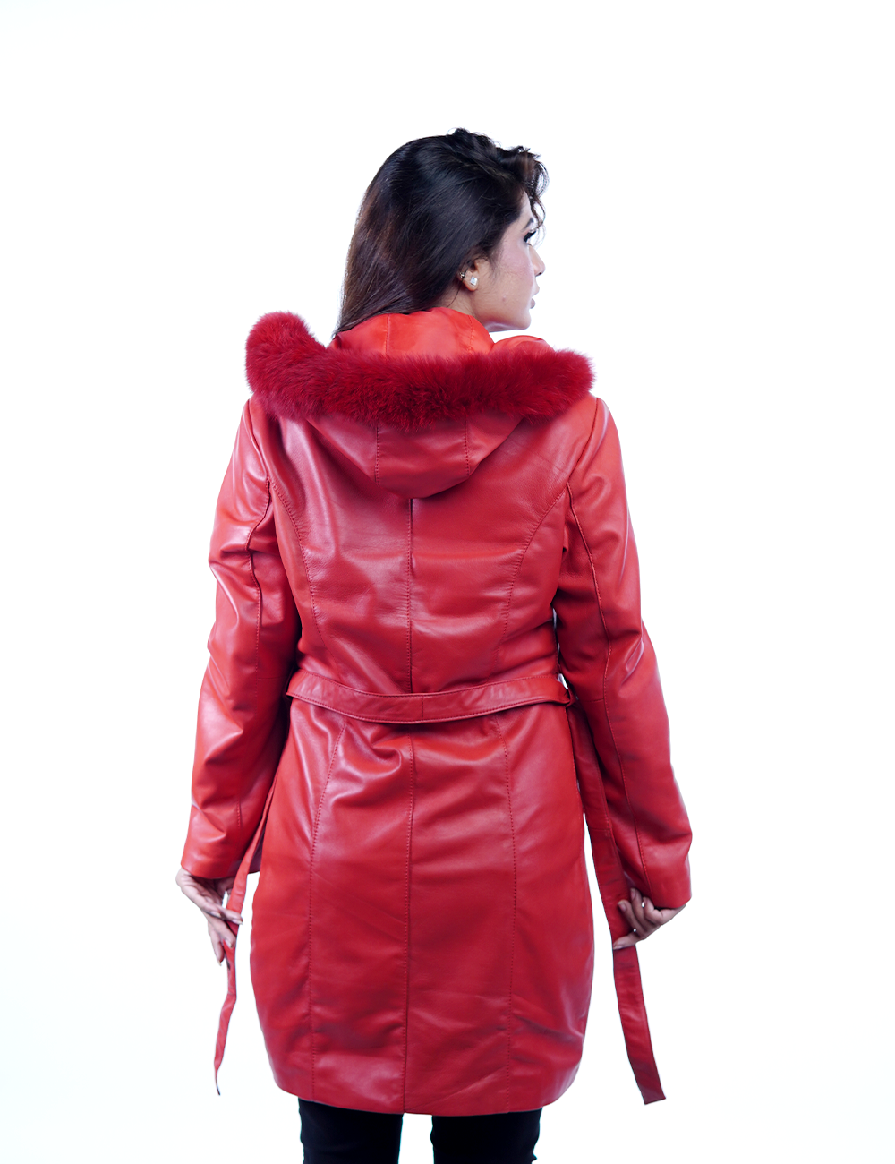Women’s Red Sheep Leather Coat with Detachable Hood – By Umhashco